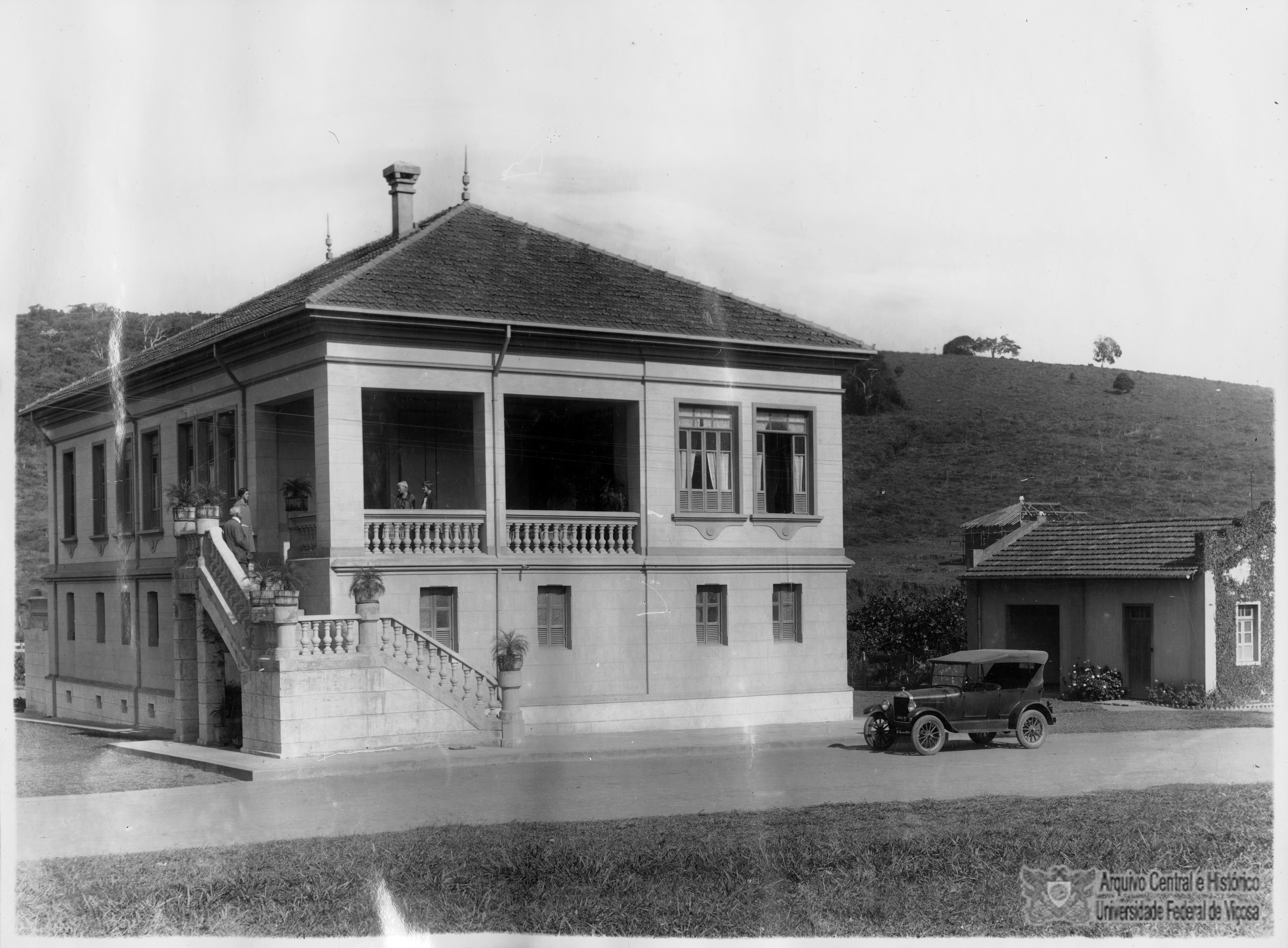 Residência do Diretor. Na escada Peter Henry Rolfs com a filha Clarissa Rolfs e na varanda Effie Rolfs e uma pessoa não identificada. À direita, Biblioteca de Rolfs.