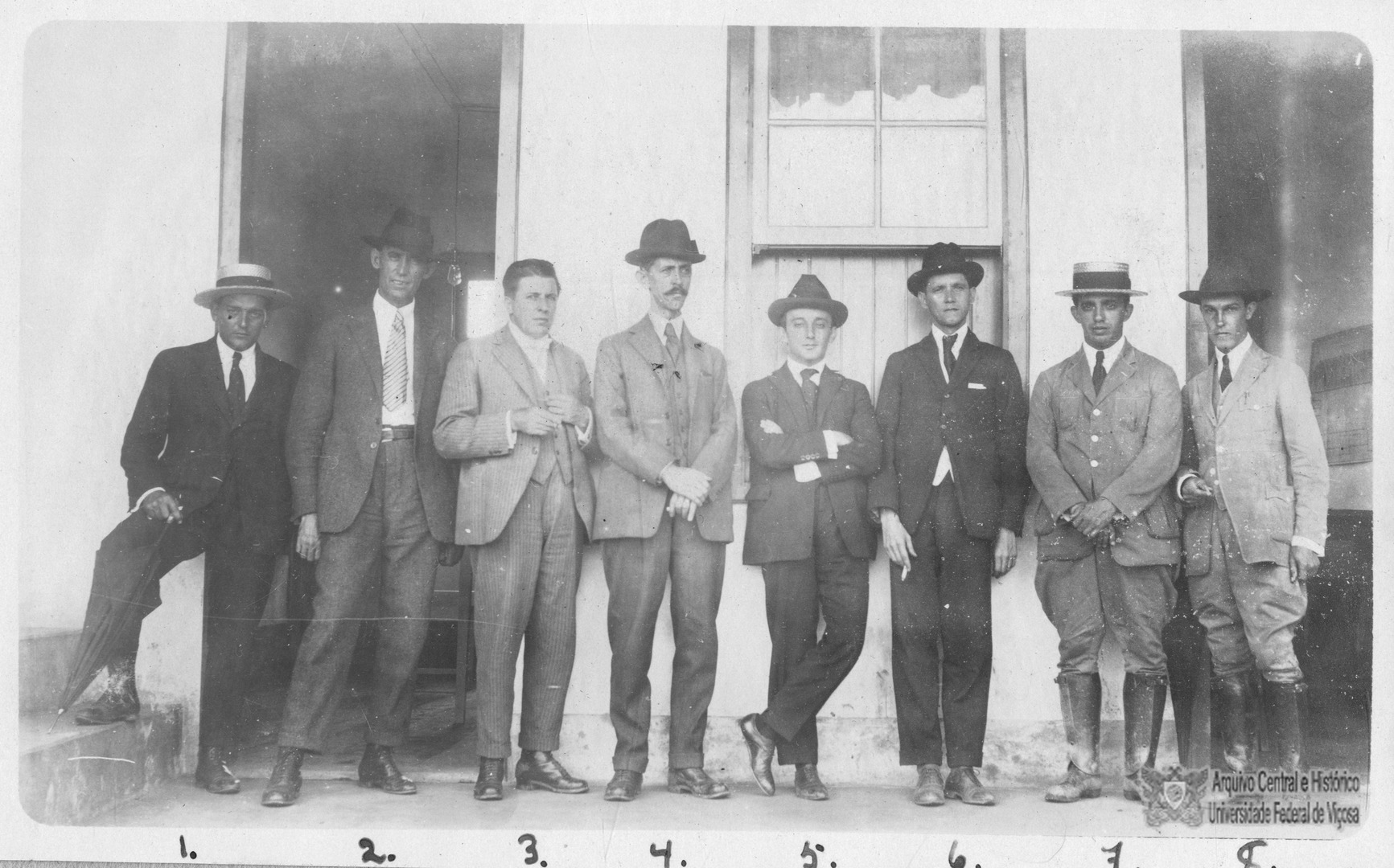 Construtores da ESAV recebendo visitantes no barracão das oficinas da ESAV. Identificação: 1 Nelson Ferraz; 2 Pedro Martins; 3 Isauro Vaz de Mello; 4 Dr. Arnaldo Carneiro Vianna; 5 Mario Monteiro Machado; 6 José Gomes Brandão; 7 João Carlos Bello Lisbôa. 8 Mario das Neves Machado.