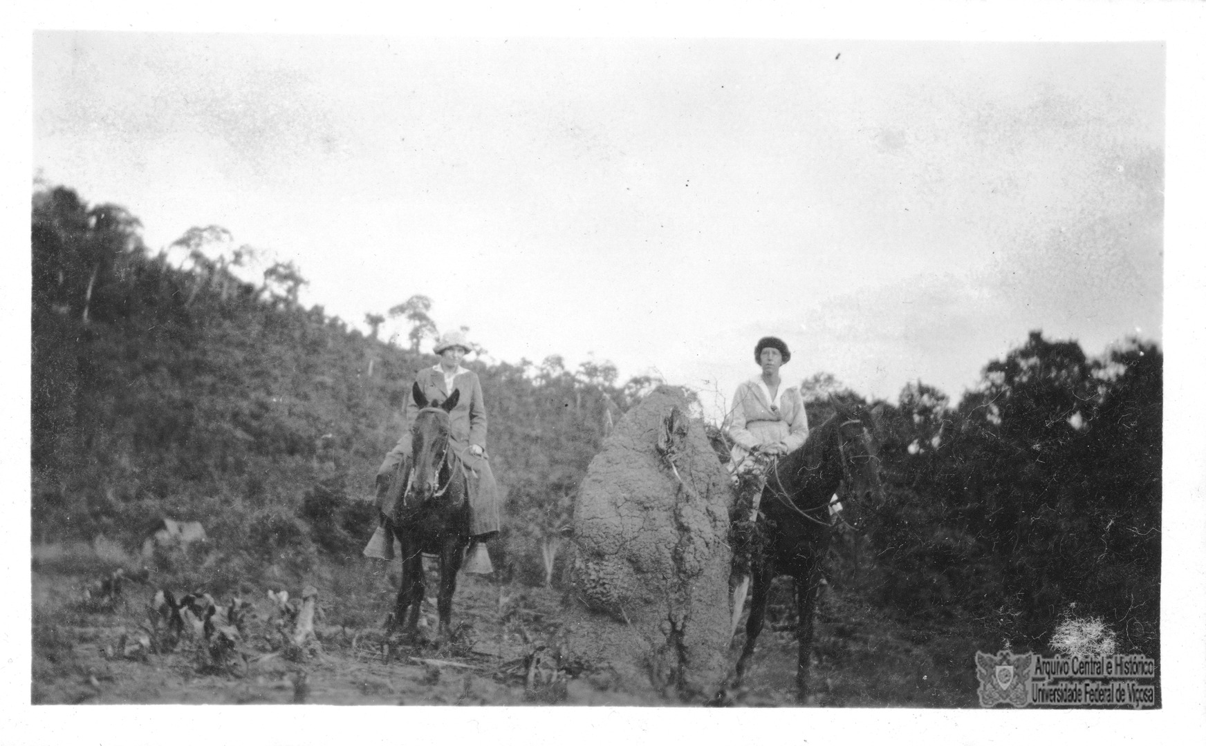 Misses Pidgeon e Clarissa Rolfs estão à cavalo ao lado de um cupinzeiro.