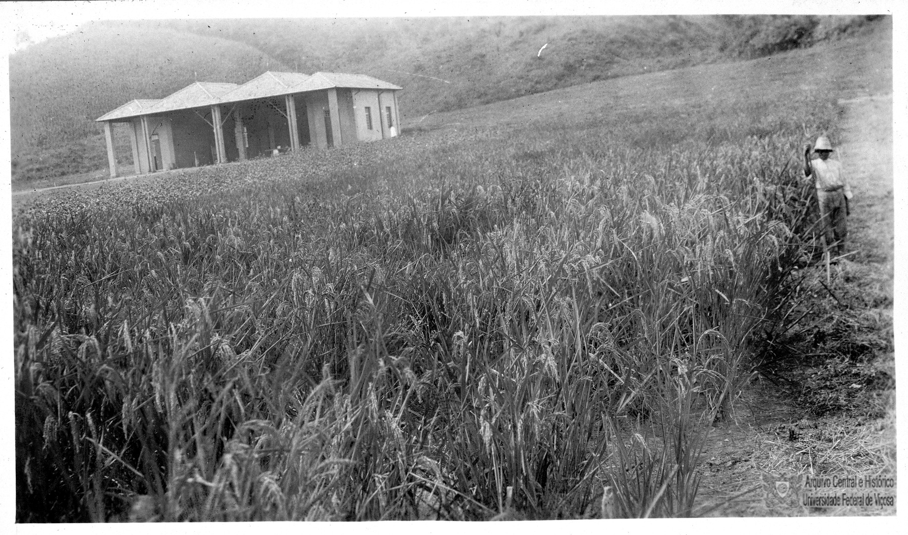 Funcionário da ESAV em meio a área experimental da Escola, e ao fundo, Abrigo da Engenharia Rural.