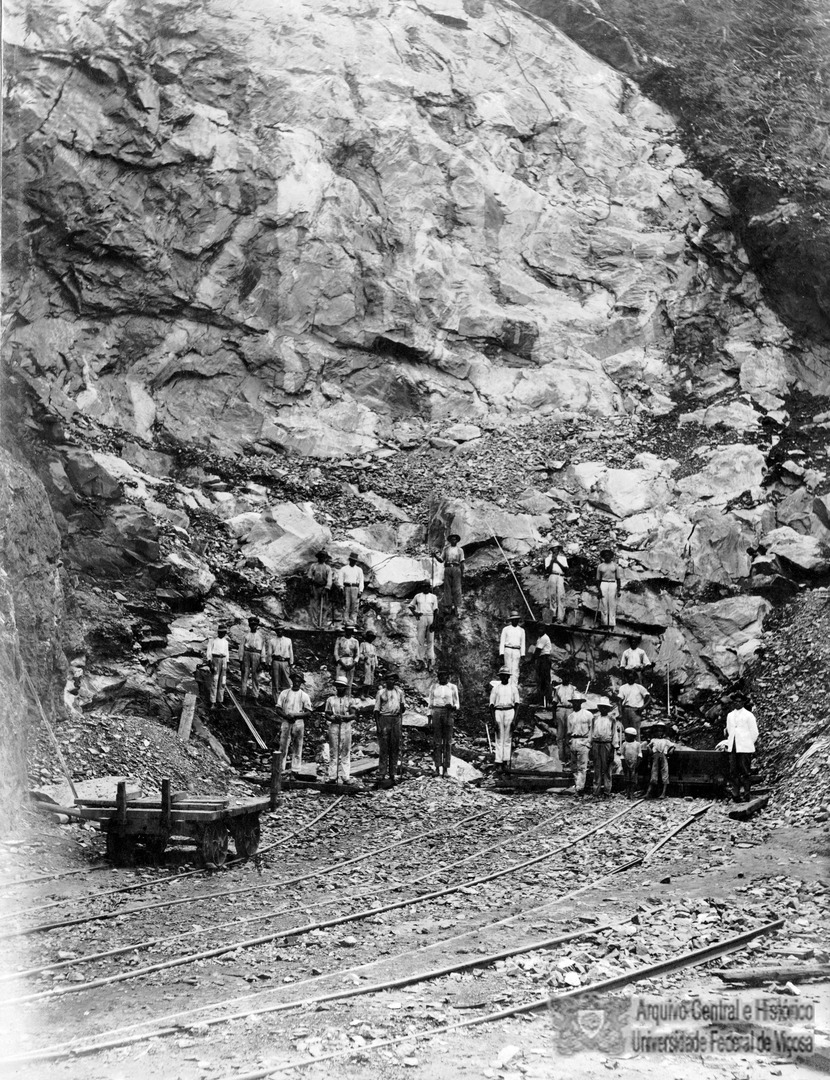 Operários trabalhando na pedreira da ESAV utilizando vagonetes como meio de transporte do material. A Pedreira situava-se nas proximidades do Departamento de Zootecnia.
