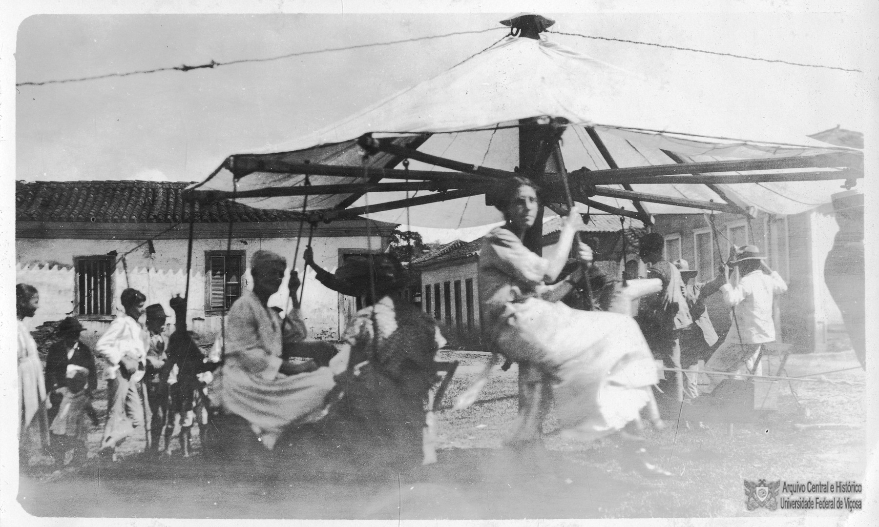 Pessoas se divertindo em um carrossel instalado, provavelmente, na cidade de Viçosa. Destacam-se na imagem a senhora Effie Rolfs e a miss Clarisse Rolfs, respectivamente, esposa e filha de P. H. Rolfs.
