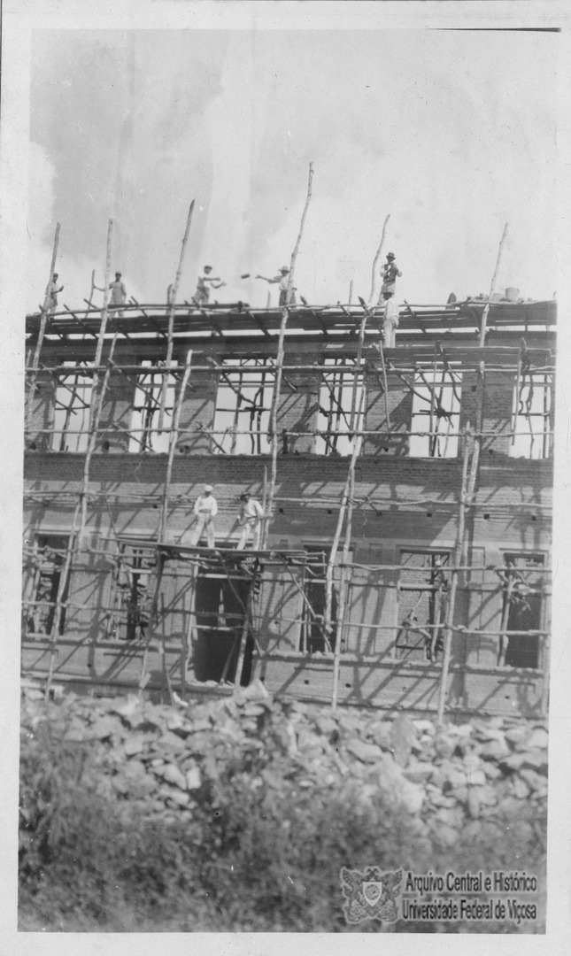 Operários trabalhando em andaimes na construção da fachada lateral do Edifício Principal.