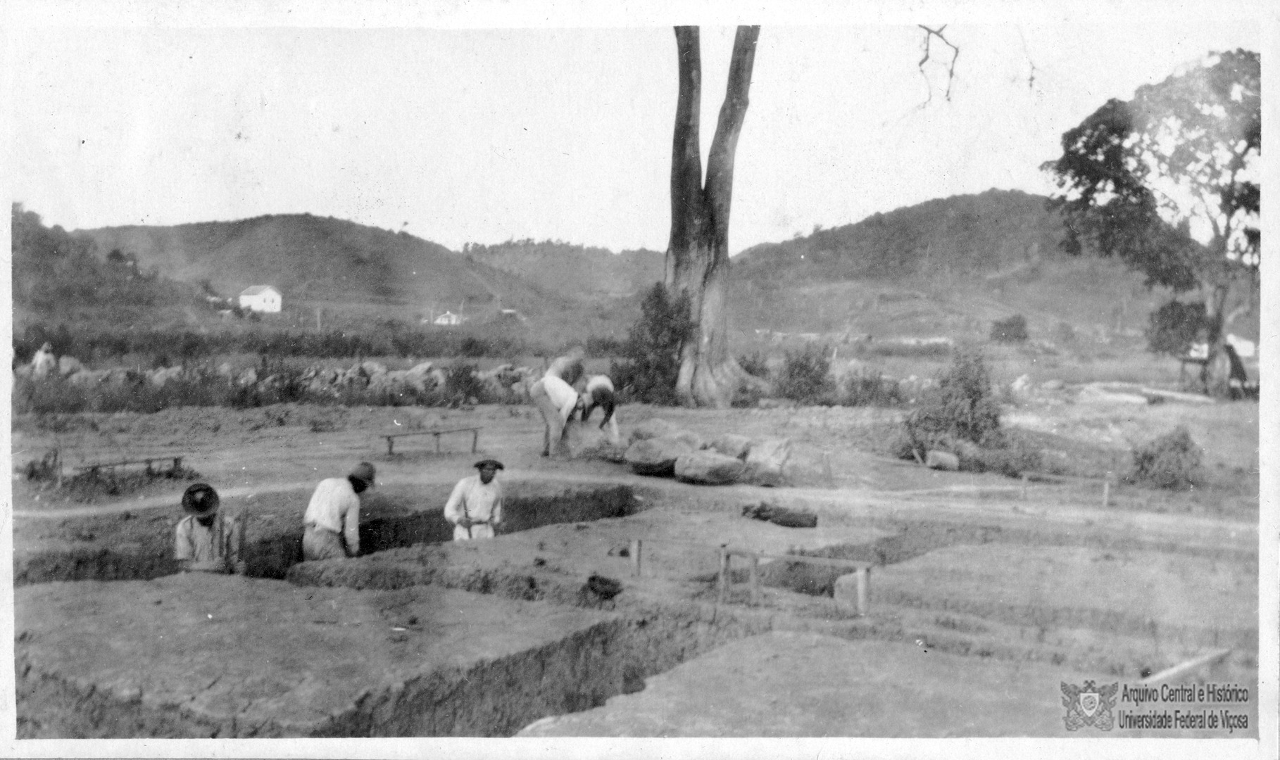 Operários trabalhando na colocação de pedras angulares da fundação da Residência do Diretor.