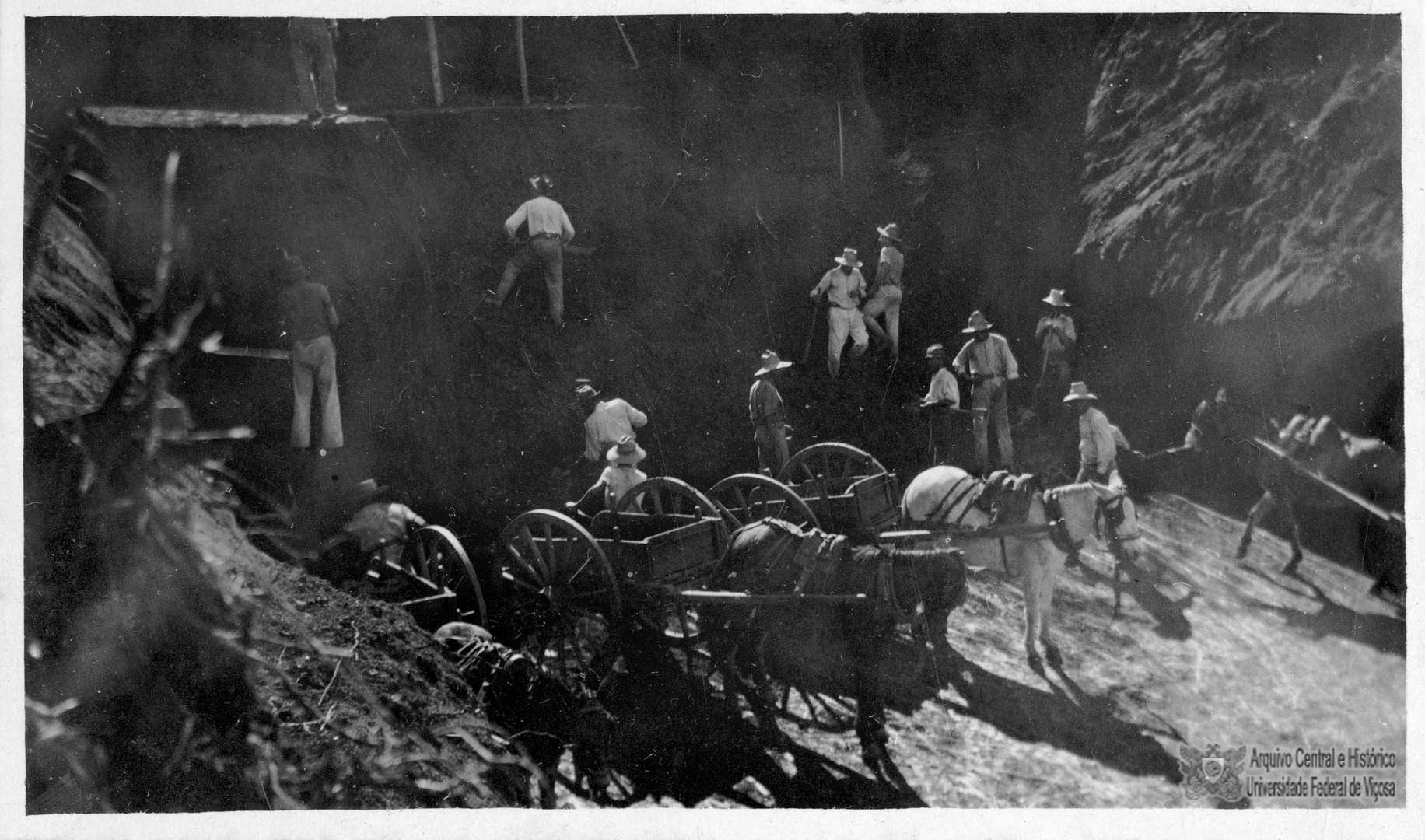 Operários trabalhando na abertura da Avenida Vaz de Melo. Os muares serviam como meio de transporte para o carregamento do material da obra.