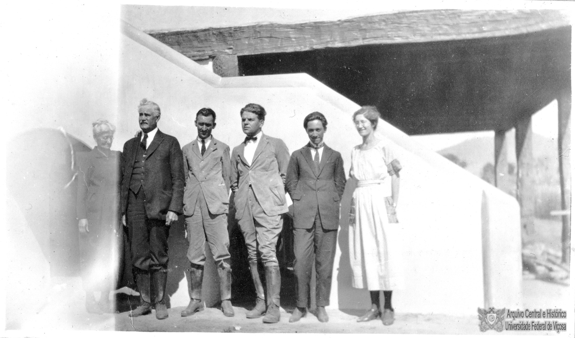 Família Rolfs na primeira residência ao lado de visitantes. Ao pé da escada: Effie Rolfs, Peter Rolfs, João Rezende, Enrique Schmidt, Valladares Rouquette e Clarissa Rolfs.