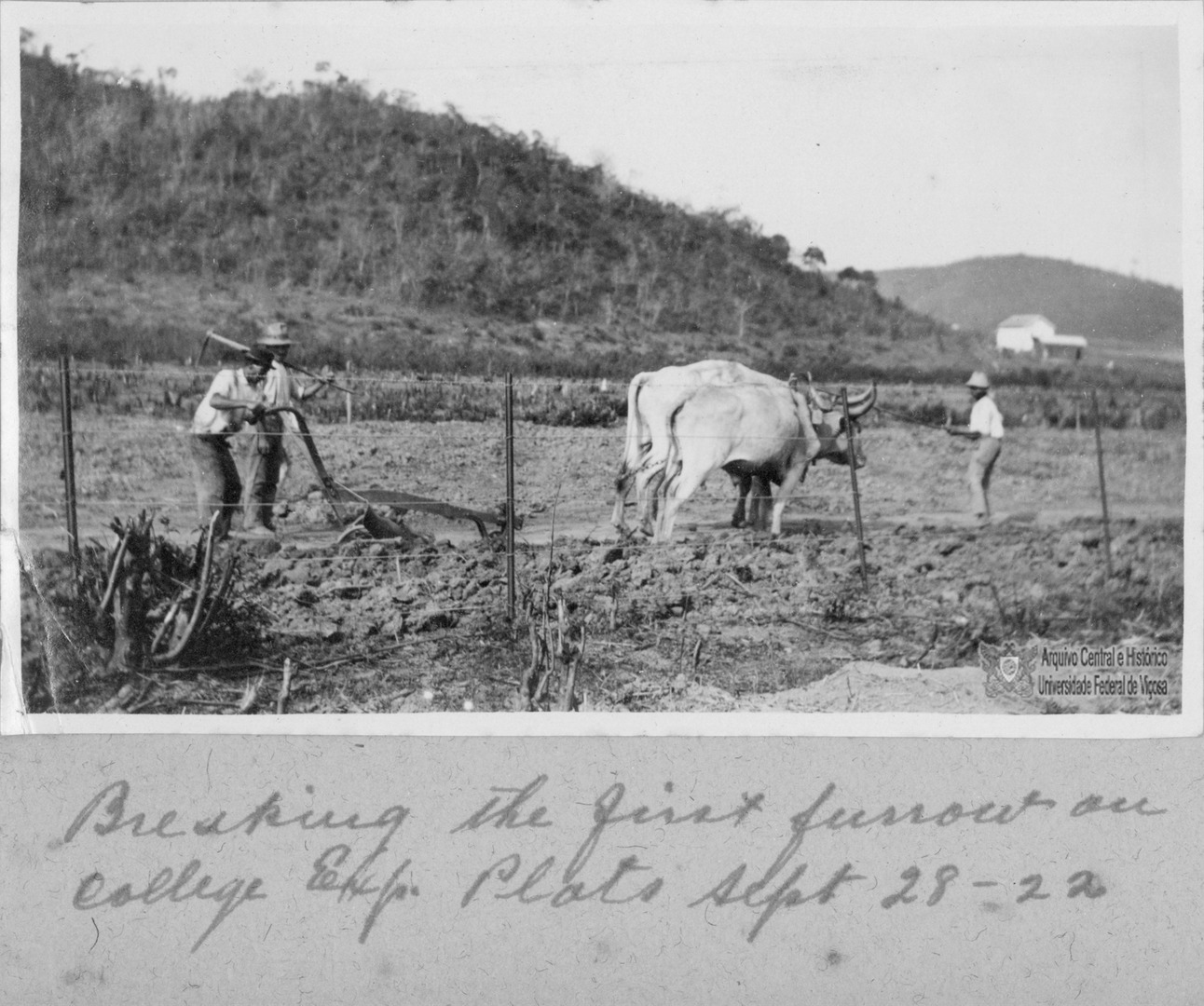 Em tradução própria: Abrindo o primeiro sulco no Campo Experimental. Impressão em 28 de setembro de 1922